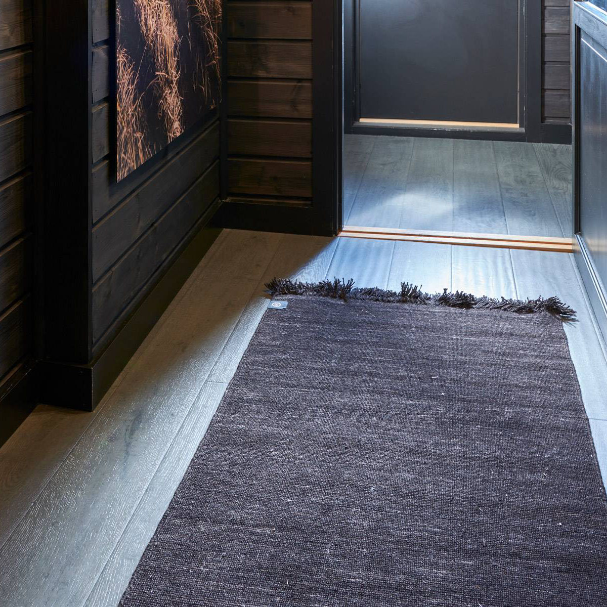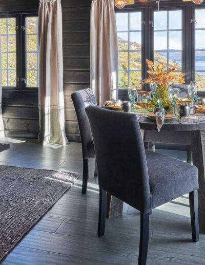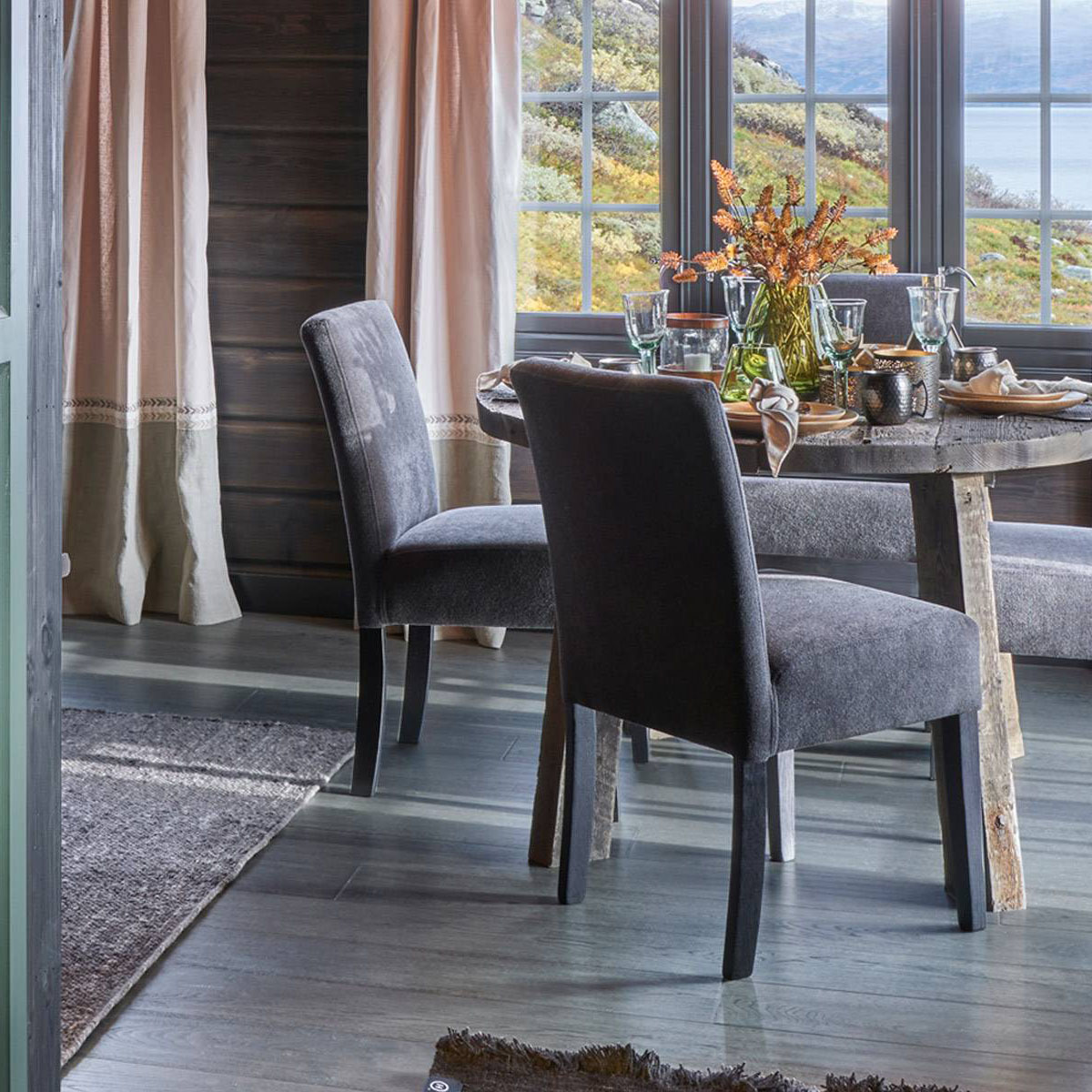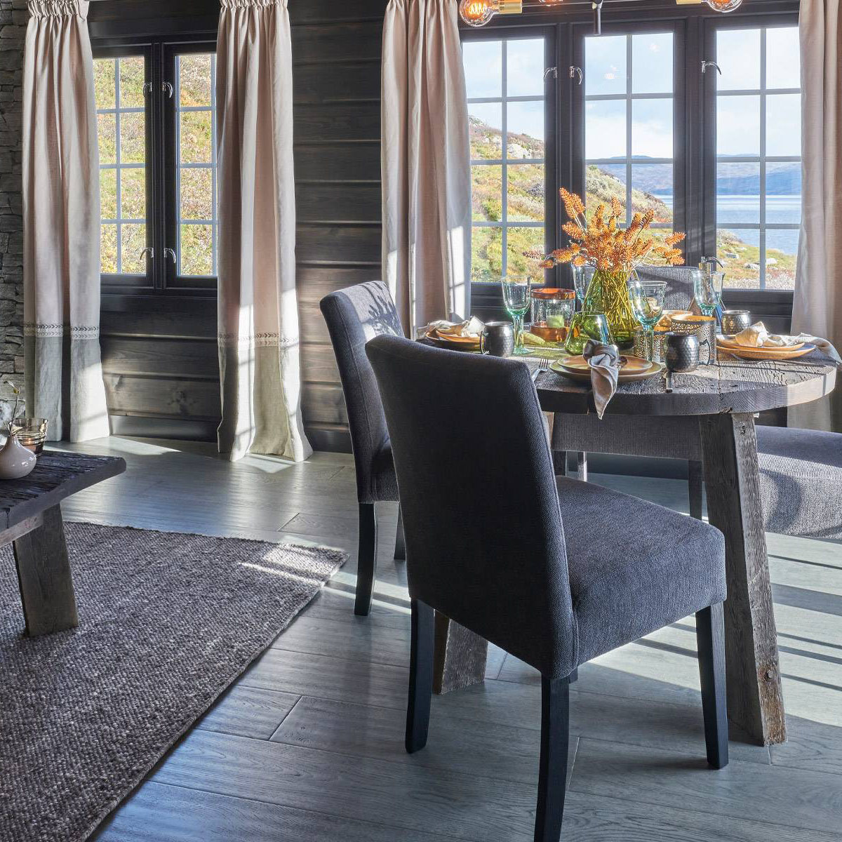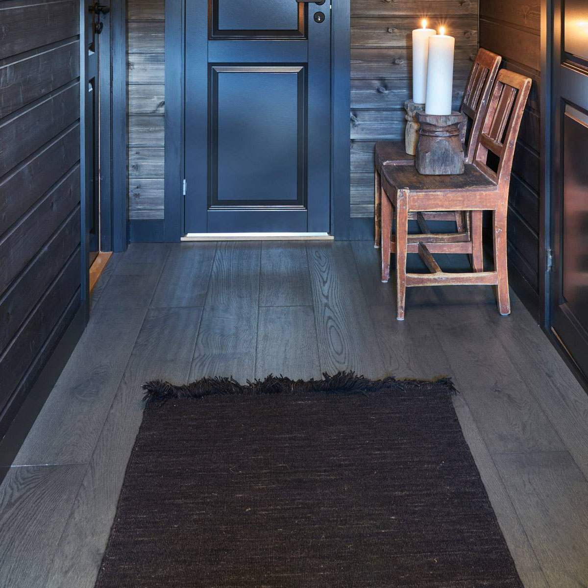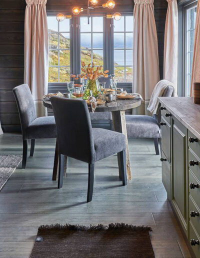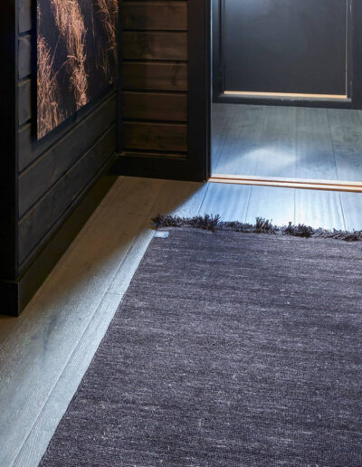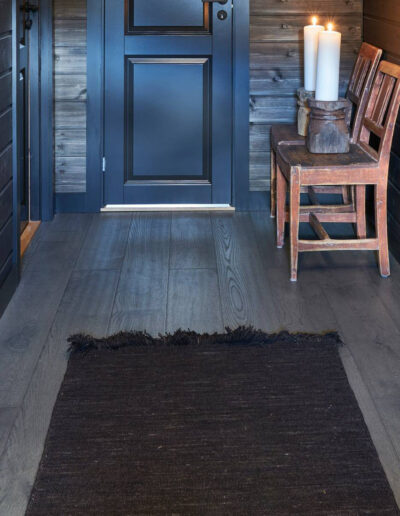 Vakker parkett i mørke grå mot antrasitt og værbitt overflate. Dette er et parkettgulv med farger i fra fjellets virkelige lød. Den store trenden nå på fjellhytter er at tømmervegger og gulv går i ett mot store vindusflater som slipper inn mye lys. Parkett Hemsedal er Ustaoset enkel å kombinere mot beis fra Jotun eller Tyrilin hvor det treffer nærmest perfekt. Jotun sin KULLSORT er benyttet av flere.